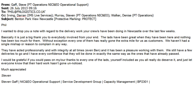 "The lads have been great when they have been here and nothing has been too much for them. Without exception every one of them has really gone the extra mile for us as customers."